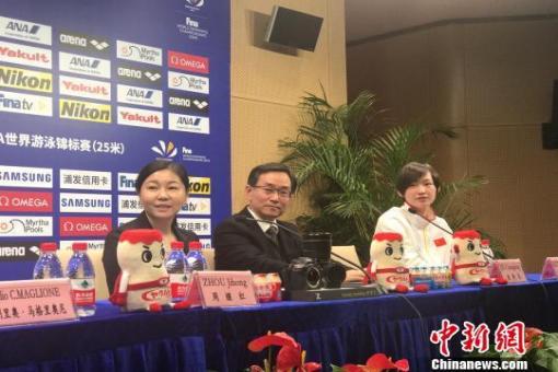 中國游泳協會主席周繼紅(左1)和李冰潔(右1)出席發布會 馬元豪 攝 中新網杭州12月11日電 (馬元豪)2018年國際泳聯世界游泳錦標賽(25米)(以下簡稱短池世錦賽)……