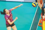 4月3日,天津隊球員李盈瑩(左)在比賽中扣球。