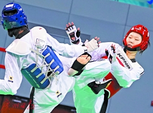 張夢宇(右)在跆拳道女子67公斤級為廣東代表團再添一金。新華社記者 郭晨 攝