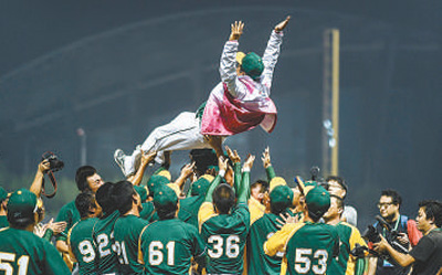 天津棒球隊隊員將教練高高拋起慶祝奪冠。W7q安康新聞網