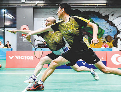 男子C組(50歲以上)雙打決賽北京隊選手母利恩(右)、郭曉宏在比賽中。W7q安康新聞網
