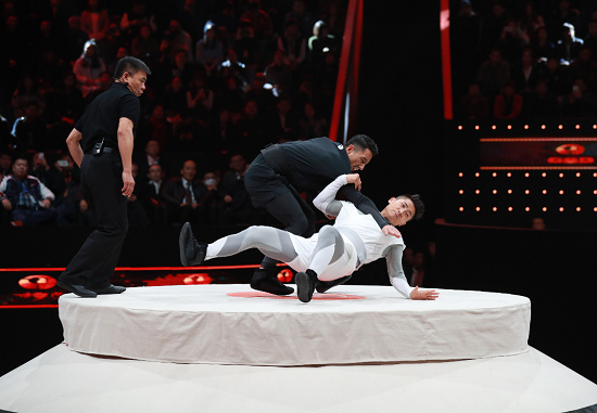 推下擂臺,背部著地,雙雙摔出場外……兩位70公斤級選手率先登場,剛柔并濟中體現力量與技巧,比賽節奏緊張、勝負扣人心弦。豐富的技術動作,復雜的勁道變化,讓熟悉跆拳道、柔道和拳擊的觀眾,見識了不同于摔、打、踢的太極技擊,現場歡呼加油聲不斷。