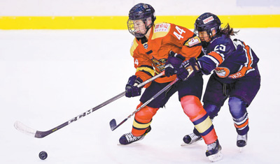 | 12月10日,深圳昆侖鴻星隊球員(左)和深圳萬科陽光隊球員在CWHL(加拿大女子冰球聯賽)常規賽比賽中拼搶。 |