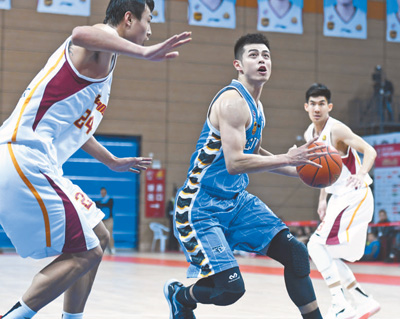 | 1月20日,北京隊球員方碩(中)在對陣浙江隊的比賽中進攻。 |