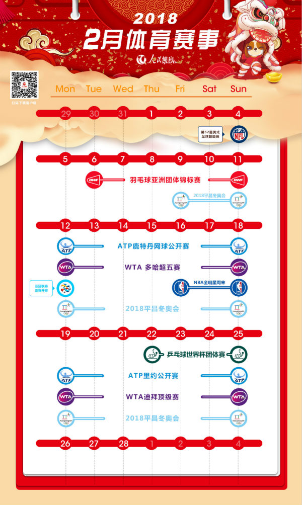 2月恰逢中國新春佳節(jié),在這辭舊迎新的月份中,體壇也大賽不斷。四年一屆的冬奧會(huì),中國冰雪健兒是否會(huì)有新的突破,人民體育記者將親赴現(xiàn)場(chǎng),為您報(bào)道;乒乓球世界杯團(tuán)體賽是乒壇開年的首個(gè)大賽。2017下半年經(jīng)歷小低谷的中國男乒急需為自己正名,面對(duì)擁有波爾、奧恰洛夫的德國隊(duì),以及進(jìn)步明顯的日本隊(duì),他們能否一一擊敗收獲8連冠,我們拭目以待。除此之外,NBA全明星周末對(duì)每個(gè)籃球迷都是大節(jié)日,看籃球巨星如何玩轉(zhuǎn)比賽;亞冠聯(lián)賽也將在本月開賽,中國球隊(duì)的表現(xiàn)令人期待。春節(jié)長(zhǎng)假,闔家歡聚,邊看比賽邊過大年,這體驗(yàn)一定不錯(cuò),收藏我們的賽歷,精彩賽事,一覽無遺。