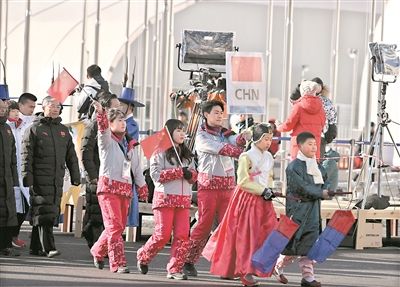 參與今天升旗儀式的中國體育代表團約有80人,在升旗后的表演中可謂是盡顯韓國特色,從冬奧村村長到表演人員都是身著韓國民族傳統服裝,而且很好地將現代與傳統結合起來,尤其特別的是在結束時表演人員盡邀參與升旗儀式的中國體育代表團集體互動,從而使得現場變成一場載歌載舞的歡樂“趴”。