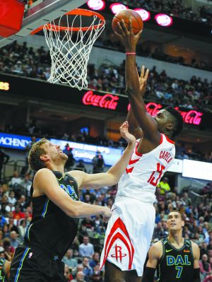 火箭隊球員卡培拉(上)在比賽中上籃。 新華社/美聯