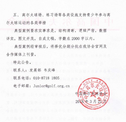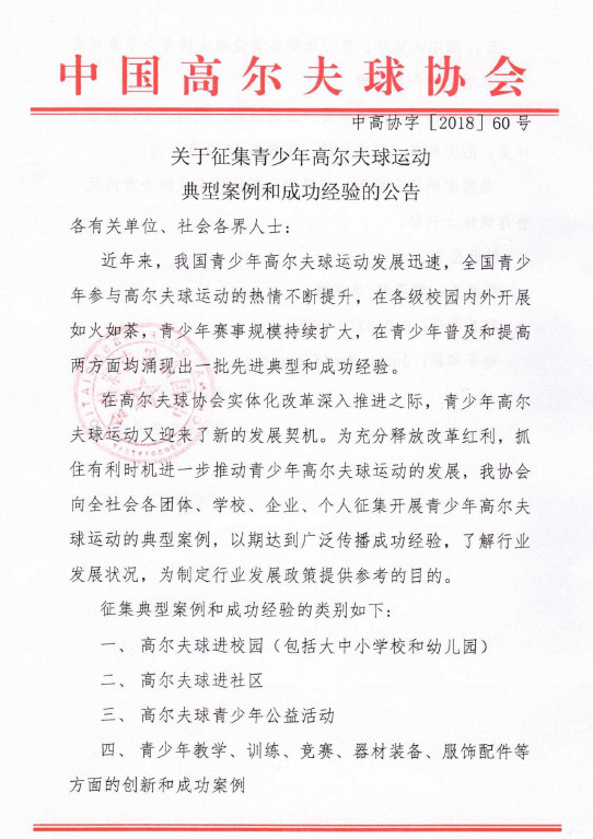 人民網北京3月22日電(楊喬棟)昨天,中國高爾夫球協會發布《關于征集青少年高爾夫球運動典型案例和成功經驗的公告》(簡稱“公告”)。公告指出,在高爾夫球協會實體化改革深入推進之際,青少年高爾夫球運動又迎來了新的發展契機。為充分釋放改革紅利,抓住有利時機進一步推動青少年高爾夫球運動的發展,我協會向全社會各團體、學校、企業、個人征集開展青少年高爾夫球運動的典型案例,以期達到廣泛傳播成功經驗,了解行業發展狀況,為制定行業發展政策提供參考的目的。g76安康新聞網
