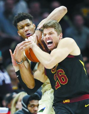 雄鹿隊球員安特托昆博(左)在比賽中和騎士隊球員科沃爾拼搶。 新華社/美聯Lwj安康新聞網