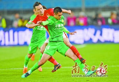 北京國(guó)安隊(duì)球員張瑀(前)在比賽中防守廣州恒大隊(duì)球員郜林。新華社發(fā)