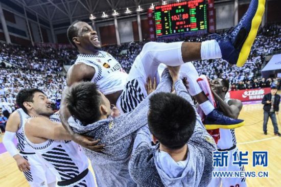 ↑遼寧隊球員在賽后將隊友哈德森(上)拋起,慶祝奪冠新華社記者潘昱龍攝2Tj安康新聞網