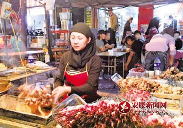 朝陽門外的陳家大串肉,引領了大串肉的風潮。朝陽門里的老翁家烤肉,有著固定的食客隊伍。隔壁的金老五燒烤,同樣是老店。東正街的賽熱燒烤,重新租了房子、裝修成具有伊斯蘭風格,在大串肉的基礎上增加了架子肉、烤羊排。清真餐飲老店清雅齋也在門前的空場子開起了夜市。喻家燒烤除了特色炒雞爪,烤肉也是必不可少的經營范圍。Wyq安康新聞網