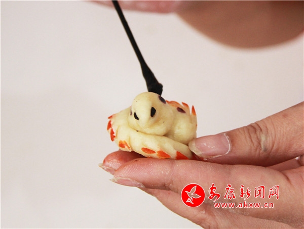 “做花饃先要做饃盤(基座),饃盤可大可小,一般有兩個饅頭大,然后將發酵好的面團用手捏、用剪刀剪成各種花兒和鳥兒等圖案作為饃頂,如果面太軟,或者圖案太大,還需要用牙簽或者較大的竹枝從饃頂部插到饃盤上,以便固定不變形,最后放在籠屜上,蓋鍋后用大火蒸,待出鍋即成為造型生動的花饃。最后再進行上色,花饃形狀最多的是喜鵲、龍、鯉魚等,造型喜慶寓意吉祥。” 花饃技藝傳承人胡志霞說道。