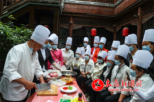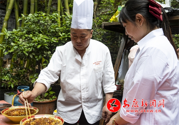 但隨著時代的發(fā)展,人們消費理念的更新,能制作傳統(tǒng)白河“三點水”宴席的人越來越少,偌大一個縣,找不出幾個能夠獨當(dāng)一面制作傳統(tǒng)宴席白河“三點水”的廚師。所以他毅然決定辭去高薪的主廚工作,奔走于鄉(xiāng)村,上門做家政服務(wù),在實地操作技藝中傳幫帶一批會制作白河“三點水”宴席的鄉(xiāng)廚。